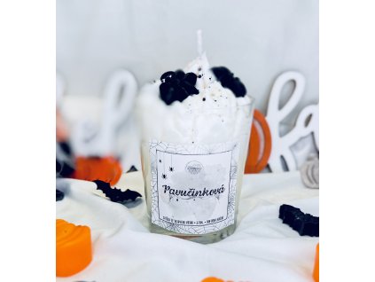 Pavučinková svíčka – jemná a éterická vůně Andělských křídel v halloweenském kabátku. 🕯️🕸️ Dokonalá kombinace tajemna a něžnosti.