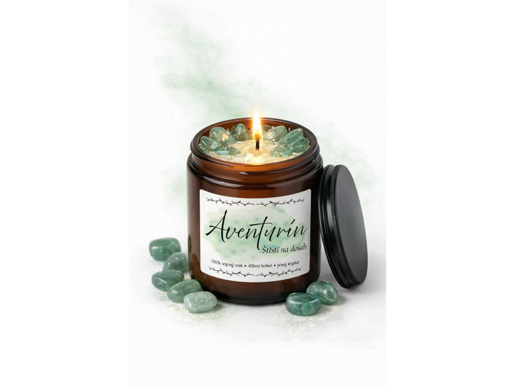 Krystal aventurínu je umístěn na povrchu svíčky a je přirozenou součástí jejího záměru. Každá svíčka je ručně vyráběná a jedinečná – rozložení krystalu se může jemně lišit, stejně jako cesty, které nás vedou ke štěstí.