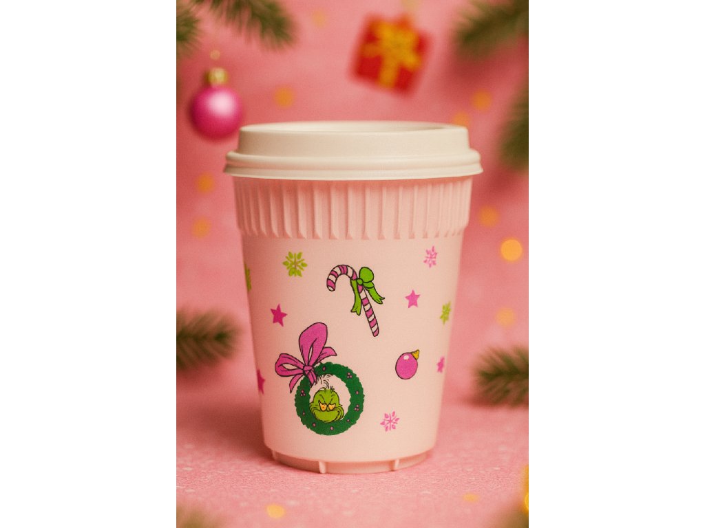 HOT CUP Mr. Grinch Pink přináší hravý mix vánoční ironie a růžové elegance.