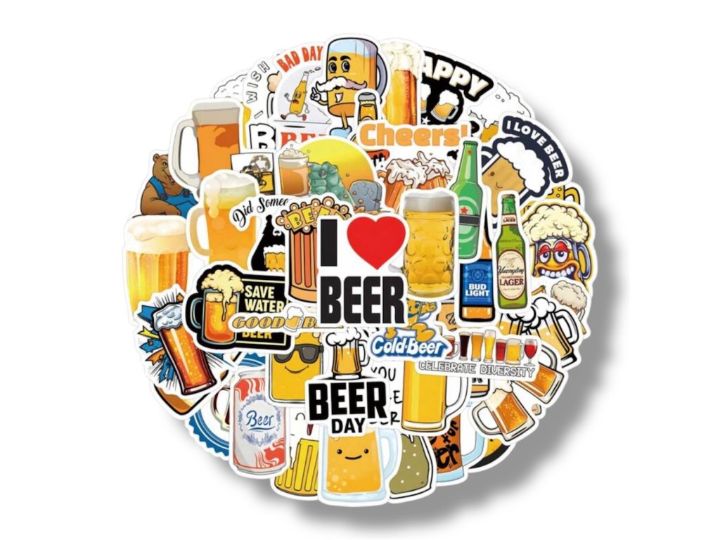 Každá samolepka nese kus dobré nálady – půllitry, pěna, vtipné nápisy i symboly, které ocení každý milovník piva.