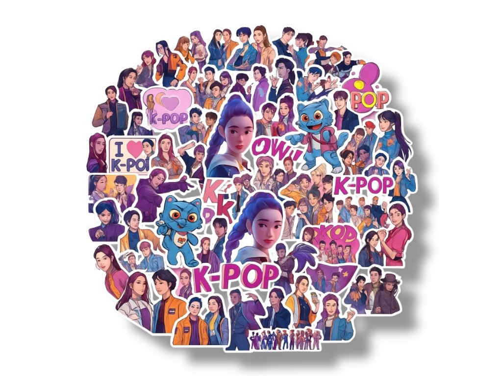 Každá samolepka odráží ten jedinečný k-pop vibe – ikonické loga, srdíčka, mikrofony, bubliny, pastelové barvy i motivy inspirované skupinami jako BTS, Blackpink, Stray Kids, Twice a další. 💜