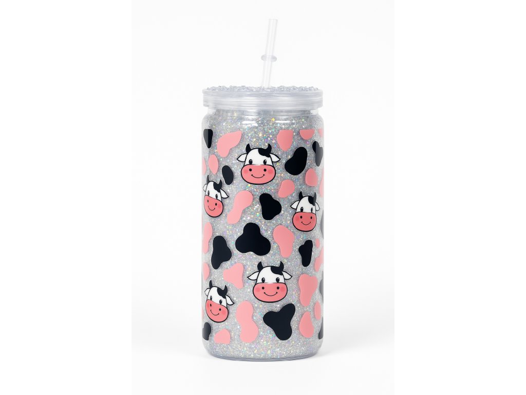 Tento CutieCup spojuje hravost a jemnost – bílý základ, černé nebo růžové „kravičkové“ skvrnky a pohyblivé třpytky vytvářejí dokonalý kawaii efekt. ✨