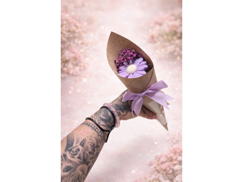 Tento květinový kornout je něžným spojením estetiky a vůně. Obsahuje jeden ručně vyráběný květ z vonného vosku, pečlivě uložený v kornoutku a dozdobený elegantní mašlí.