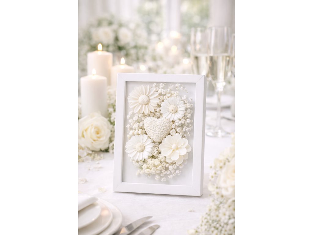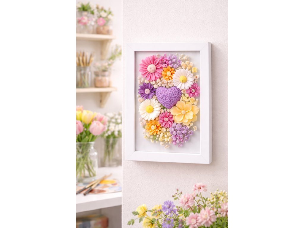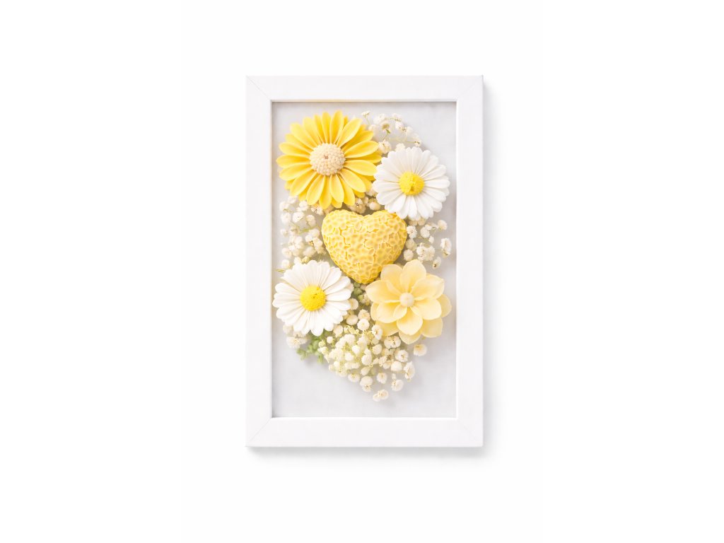 Základem je klasický fotorámeček o velikosti 10 × 15 cm, který jsem proměnila v malý květinový obraz. Na jeho povrchu jsou připevněné květy z vonného vosku doplněné o sušené květiny, které dodávají celé kompozici lehkost a přirozenost.