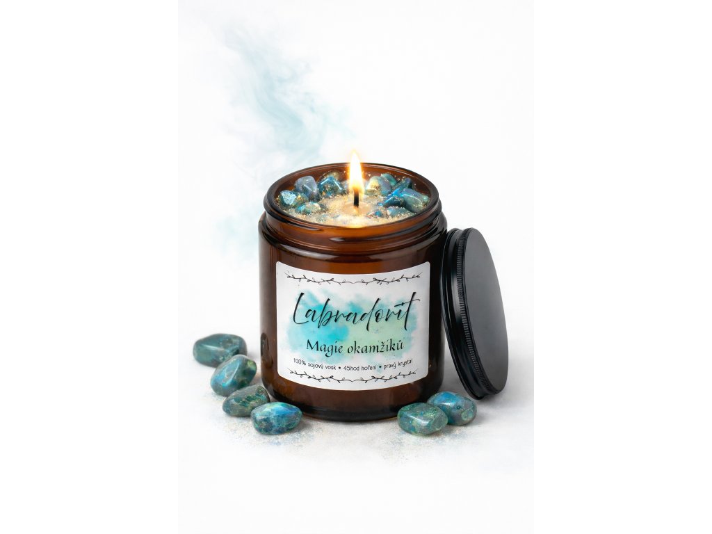 Svíčka Labradorit – Magie okamžiku vznikla jako pozvánka k tichému zastavení a hlubšímu vnímání sebe sama. Labradorit je po staletí spojován s intuicí, ochranou a schopností vnímat jemné změny v našem vnitřním i vnějším světě. Jeho energie je tajemná, ochranná a transformační.