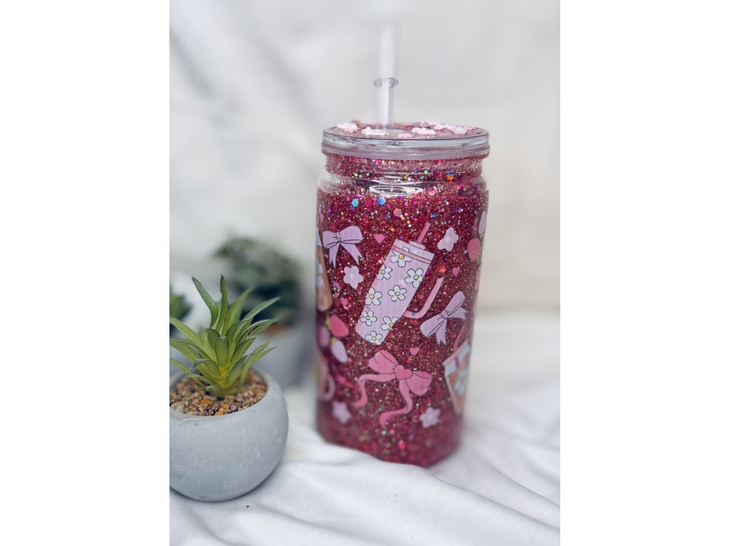 Uvnitř kelímku najdeš pohyblivé třpytky laděné do tónů růžové.