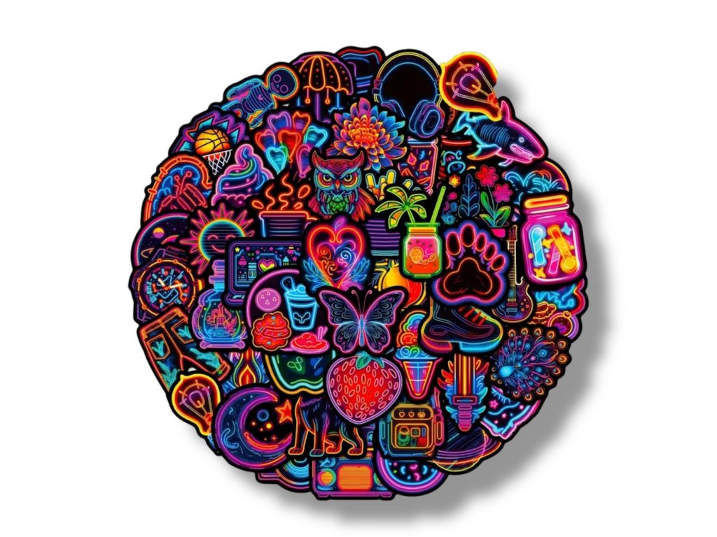 Každá samolepka je malý výbuch kreativity – neonové odstíny, kontrasty a odvážné motivy, které tě prostě nenechají bez úsměvu. 😍