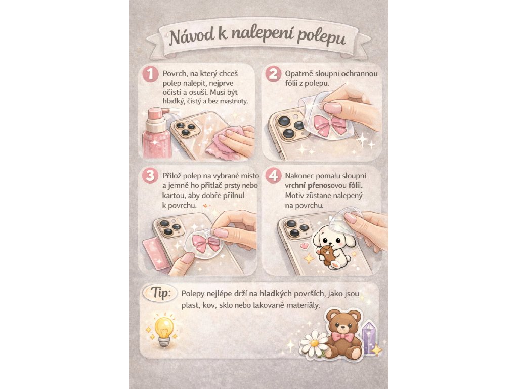 - Přilož polep na vybrané místo a jemně ho přitlač prsty nebo kartou, aby dobře přilnul k povrchu.