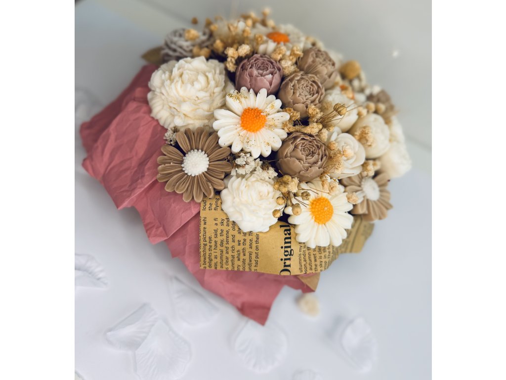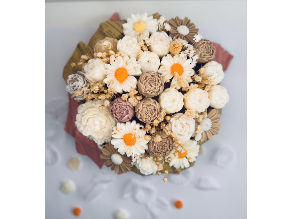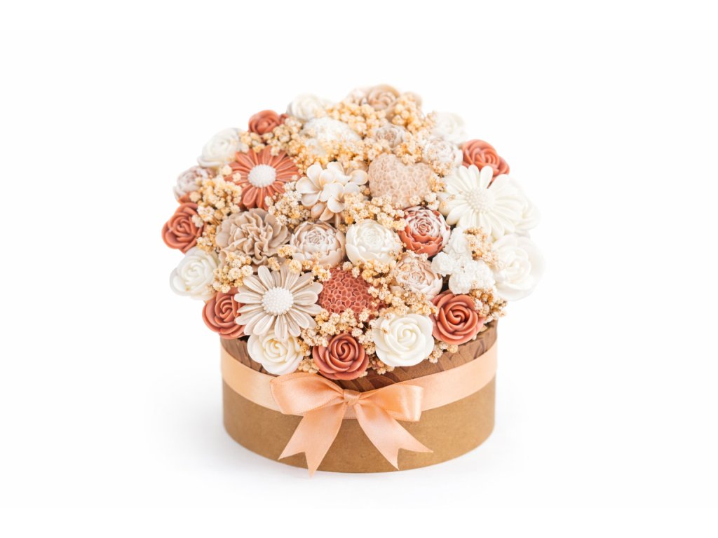 Flowerbox XXL – Mega velikost v přírodních odstínech je opravdový klenot mezi našimi voňavými kolekcemi. S průměrem 35 cm a váhou přibližně 1200 g představuje největší a nejluxusnější variantu, kterou nabízíme. Obsahuje 25 a více ručně vyráběných voskových květin, sladěných do přírodních tónů béžové, krémové a bílé.