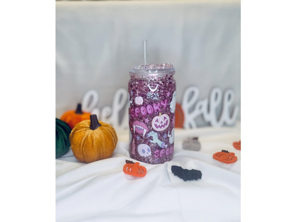 Každý kelímek je naplněn pohyblivými třpytkami sladěnými k danému designu – od roztomilých duchů, přes kostlivky až po čarodějné motivy, vždy v duchu růžového podzimu.