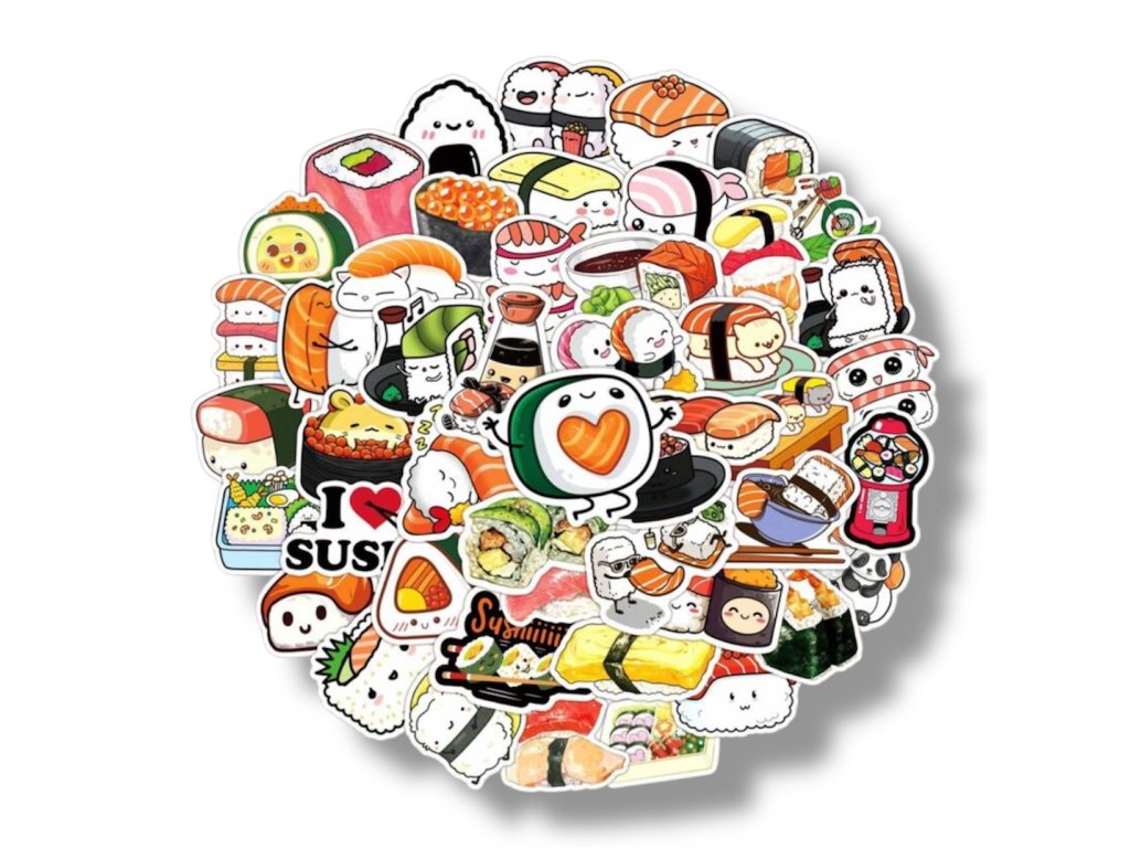 Každá samolepka v sobě nese hravý kawaii vibe – usměvavé nigiri, maki, lososy, wasabi i roztomilé hůlky.
