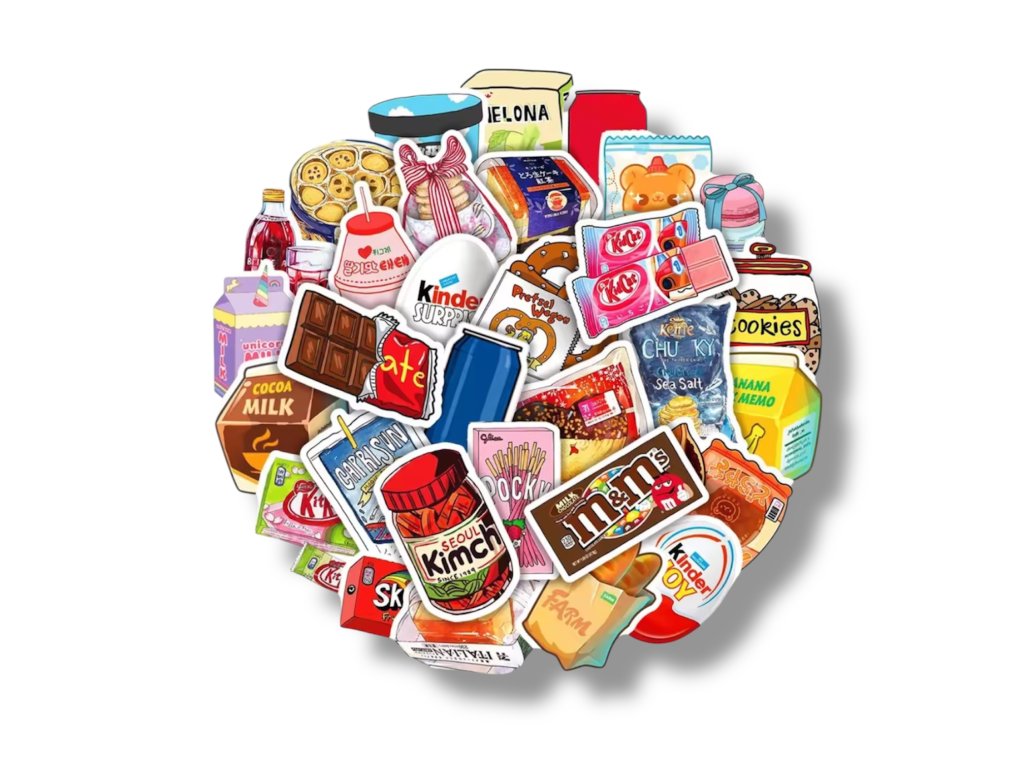 Každá samolepka v sobě nese chuť oblíbených ikon – Nutella, M&M’s, KitKat, Coca-Cola, Oreo, Haribo a další dobroty, které zná celý svět. 💕
